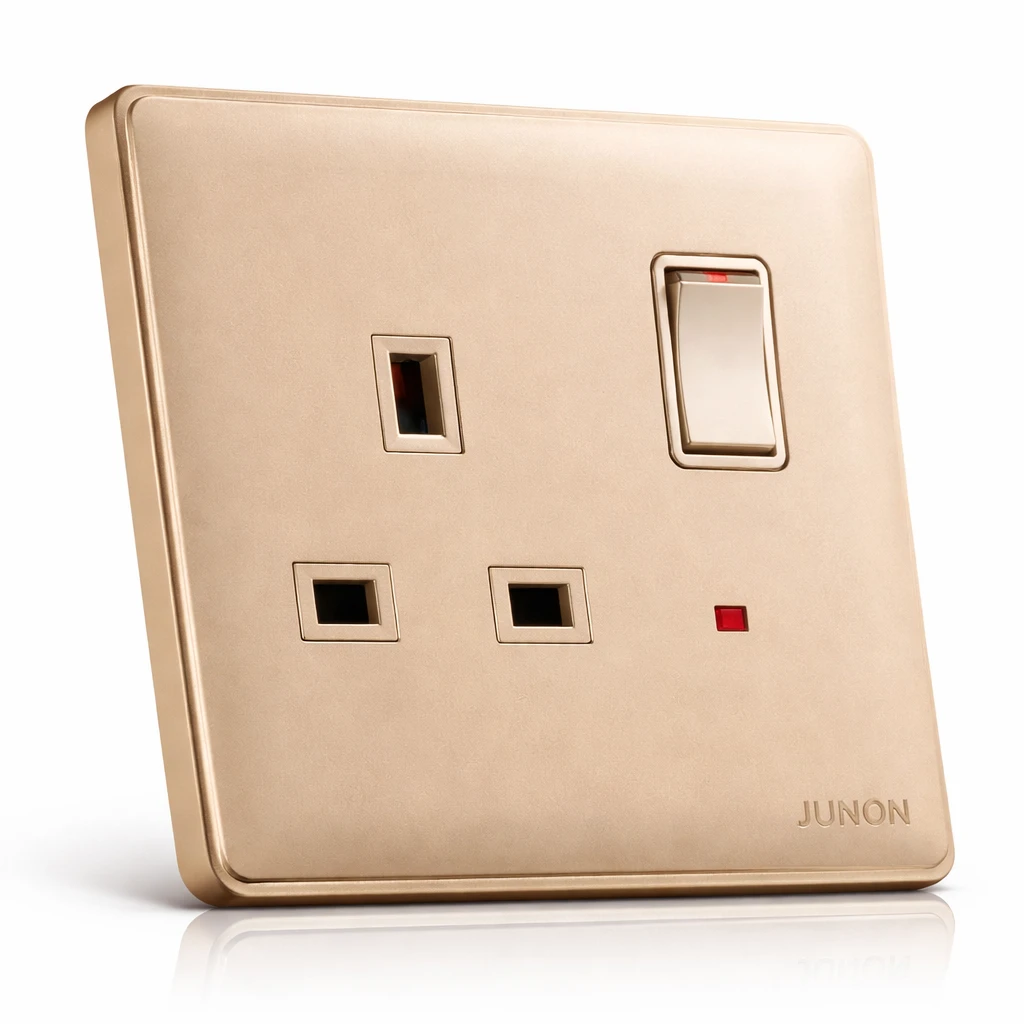 مفاتيح كهربائية فاخرة بتشطيب ذهبي راقي مستوحى من الطراز الأوروبي الحديث، تجمع بين القوة والمتانة والتصميم الملكي لتمنح المكان لمسة فخامة استثنائية تعكس الذوق الرفيع.